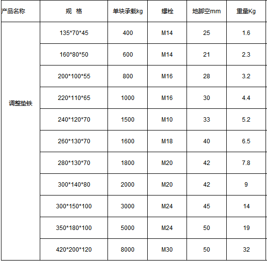 調(diào)整墊鐵使用方法:將墊鐵放置于機(jī)床下,每個(gè)墊鐵均受力后,再調(diào)整墊鐵??烧{(diào)整高度為3-15mm。調(diào)整墊鐵適用范圍:金屬加工機(jī)床,鍛壓機(jī)床、紡織機(jī)械、印刷機(jī)械、食品加工機(jī)、橡膠機(jī)械、電線(xiàn)生產(chǎn)機(jī)械、電纜機(jī)械、包裝機(jī)械、發(fā)電機(jī)及重型設(shè)備等。