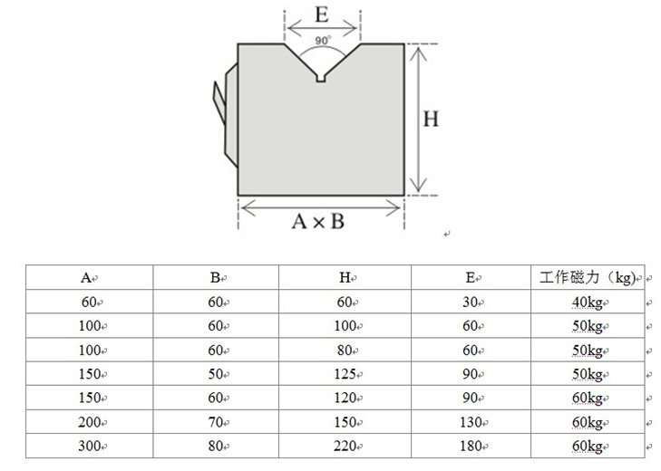 磁力V型架尺寸及工作磁力如下: